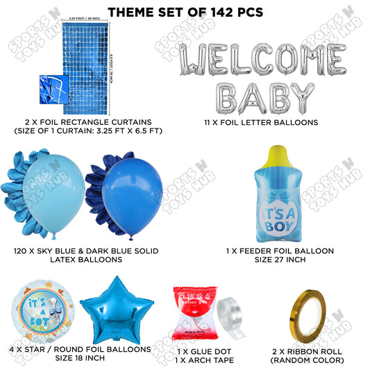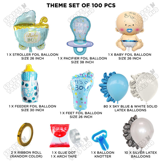 Baby Boy Feeder Foil Balloon Set With Welcome Baby Foil Letter White & Blue Color Arch Theme - Pack Of 142