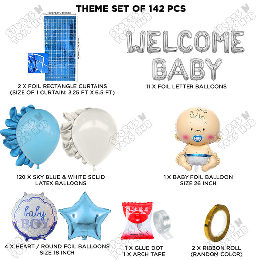 Baby Boy Foil Balloon Set With Welcome Baby Foil Letter Arch Blue & White Theme - Pack Of 142