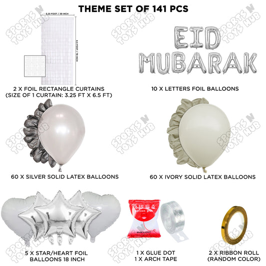 141 Pcs Eid Mubarak Silver Foil Balloon Arch Theme Collection