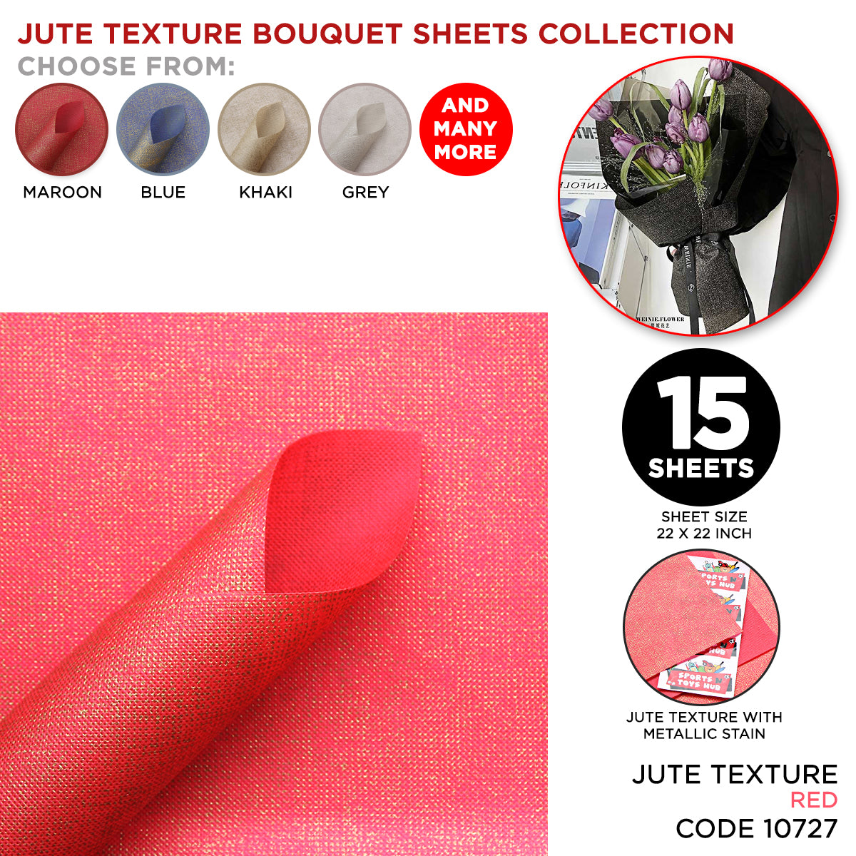 These Jute Texture Metallic Stain Non Woven Bouquet Wrapping Sheets are perfect for adding a touch of elegance to your floral arrangements. With a pack of 15, these sheets not only provide a beautiful jute texture, but also boast a metallic stain finish for added charm. Ideal for any florist looking to enhance their gift wrapping game.