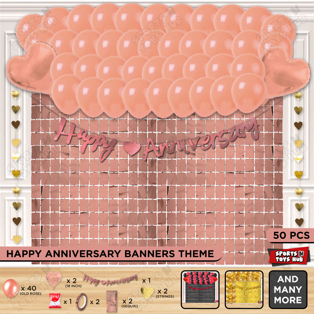 Happy Anniversary Rose Gold Cursive Banner Rectangle Curtain Theme Collection
