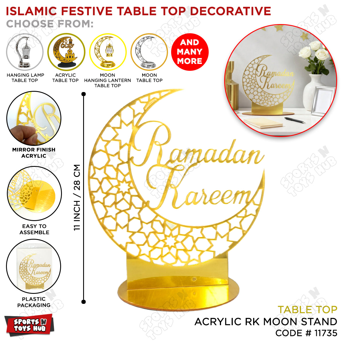 Ramadan Kareem Crescent Moon Shape Acrylic Table Stand - 11 Inch Welcome the sacred month with this striking 11-inch acrylic table stand, featuring an iconic crescent moon silhouette and "Ramadan Kareem" messaging. Crafted from premium, crystal-clear acrylic, this decorative piece brings spiritual elegance to your home, office, or event space. Its substantial size commands attention while maintaining a refined aesthetic that complements both contemporary and traditional décor. Durable and lightweight, it's perfect for display throughout the season and becomes a cherished keepsake year after year.